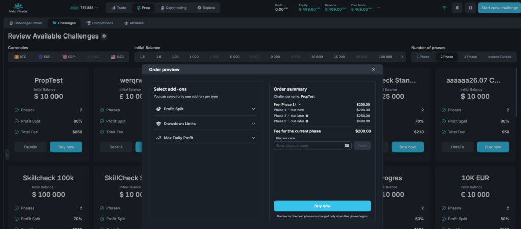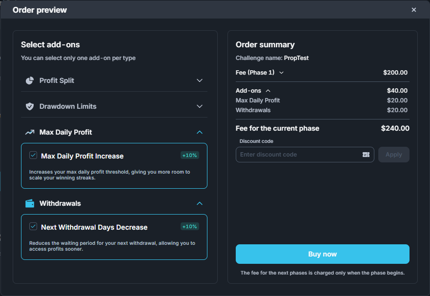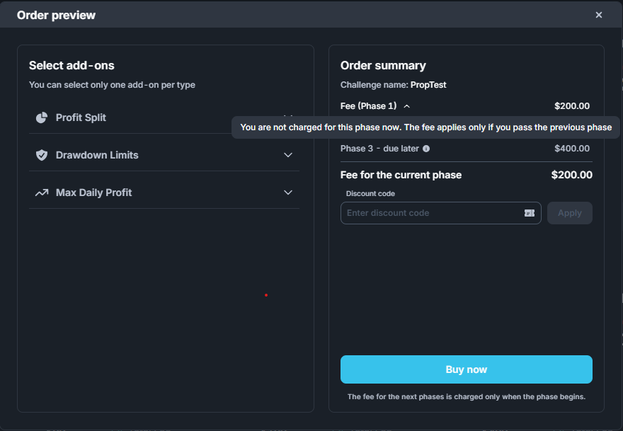 A flexible, phase-based payment model for prop trading challenges replaces the previous approach. Prop firms can now configure a separate fee for each challenge phase, enabling split payments and allowing traders to pay only for the phases they enter. This structure aligns with market trends and provides a more attractive and competitive offering. We’ve also enhanced the handling of discount codes, affiliate rewards, and add-ons, ensuring accurate calculations and a seamless user experience across all challenge phases.