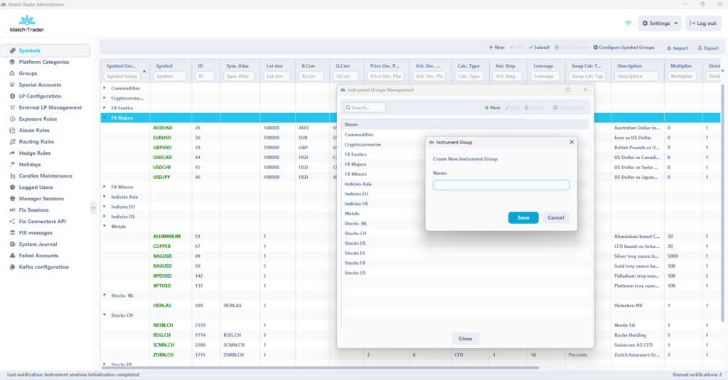 A comprehensive symbol grouping solution updates Match-Trader Admin, fundamentally transforming how trading symbols are organized, managed, and used. Brokers can now configure symbol groups themselves directly, reducing reliance on manual support and accelerating day-to-day operations. It’s possible to create, edit, and manage symbol structures, replacing the traditional flat list with an intuitive hierarchy that supports bulk operations and CSV-based import/export with group assignments.