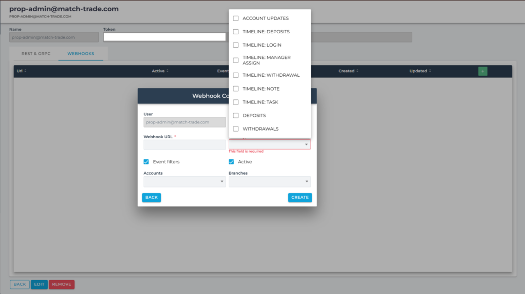 A new Webhooks management interface resides within the CRM’s API Access section, enabling brokers and partners to configure, test, and monitor real-time integrations for event-driven workflows. Authorized users can now independently create and manage webhook configurations, specifying trigger events and applying granular account or branch-level filters.