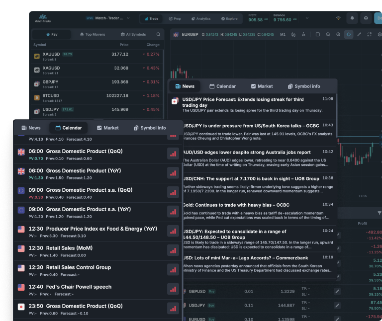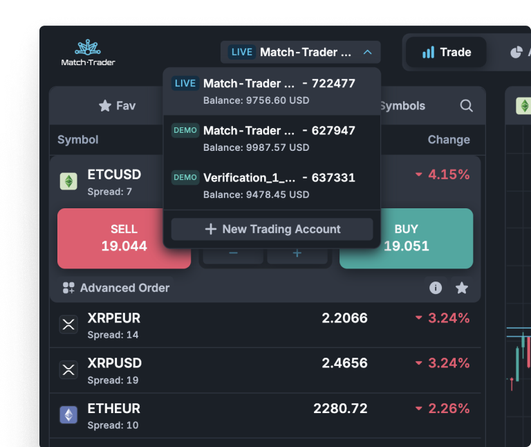Match-Trader serves as a unified hub that connects Prop Traders to multiple Brokers simultaneously. Instead of switching between different trading environments, you can manage all your accounts and execute trades through a single interface. The platform combines comprehensive market insights with multi-broker trading capabilities, helping you make well-informed decisions and optimize your trading potential.